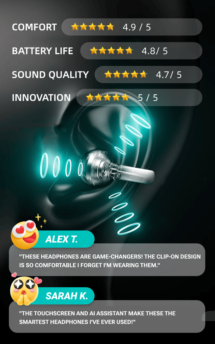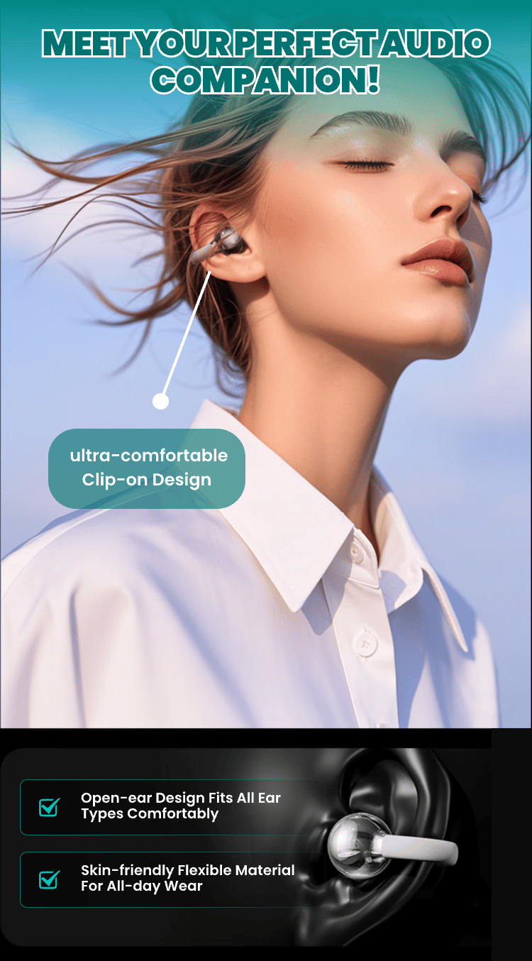 These open-ear clip headphones are awesome! They are very comfortable to wear and do not put pressure on the ears like in-ear headphones. Even if you wear them for a long time, your ears will not feel uncomfortable.