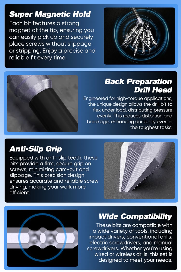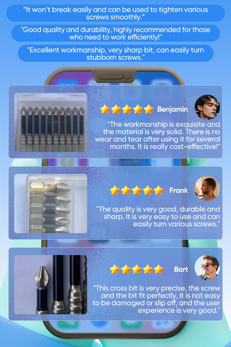 "This High-Magnetic Screwdriver Drill Bit Set is a magical tool for repairs! The material is strong and durable, there is no wear during use, the screws rotate smoothly, saving time and effort. As a DIY enthusiast, I am very satisfied with this product, it is definitely worth buying!"