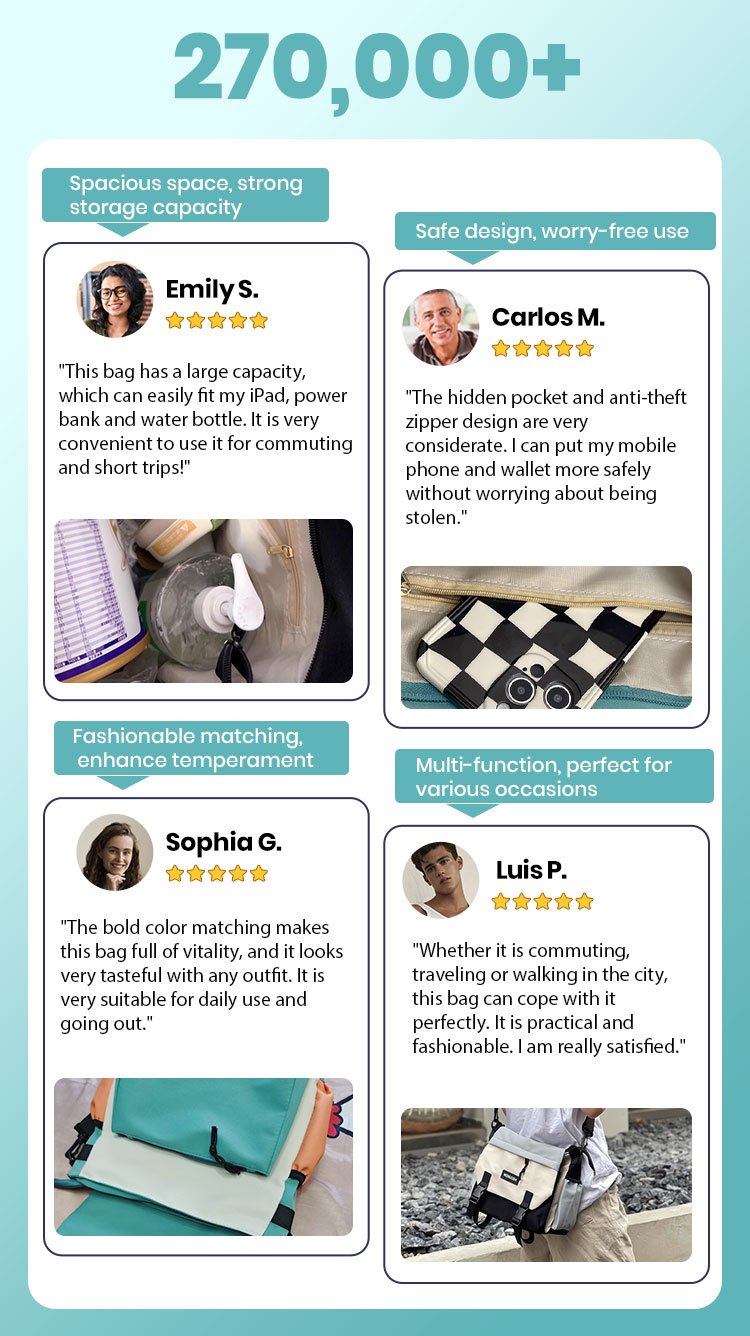 "This bag looks fantastic and goes with just about everything. I use it for both work and casual outings, and it’s been a game changer. The design is sleek, but the best part is how functional it is—plenty of pockets for all my things. Great value for the price!"