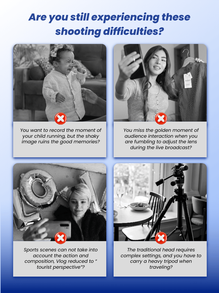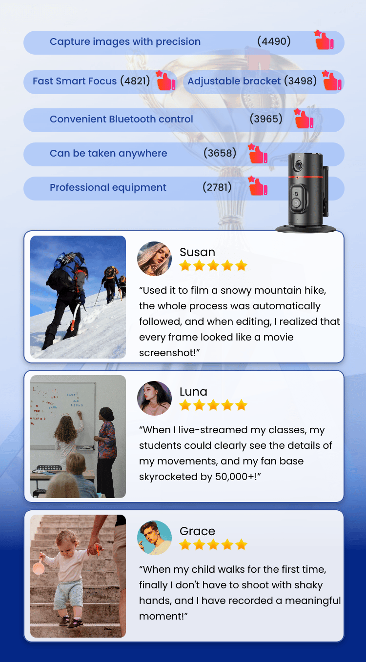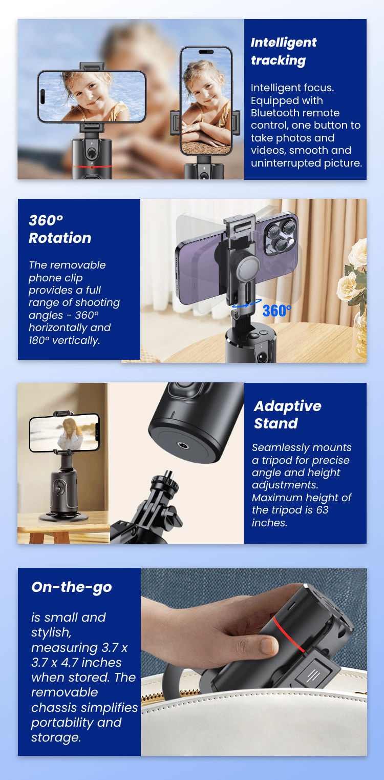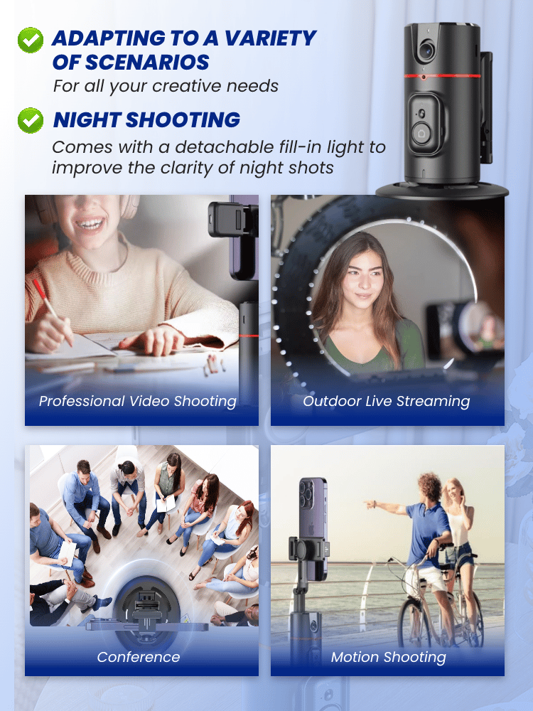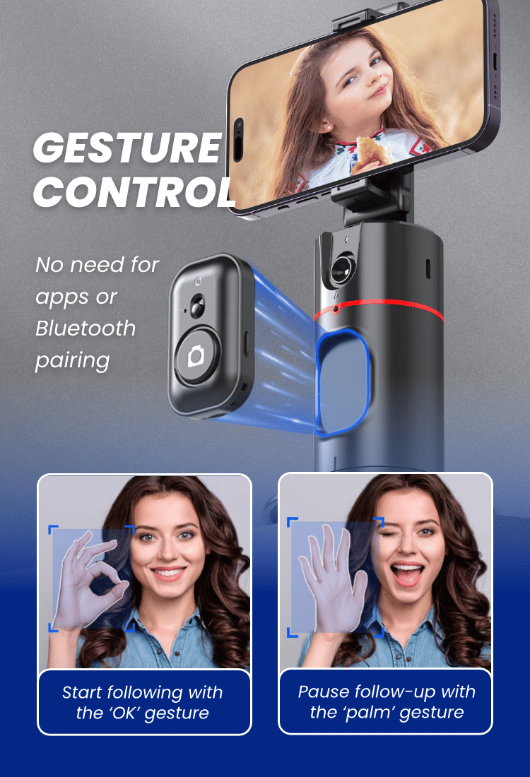 Our Auto Face Tracking Tripod Remote Control supports a variety of hands-free control methods. You can operate the head through gesture control, voice commands, etc. For example, a simple gesture can make the head shoot, pause shooting, etc. The 360° rotation function is useful in actual shooting.